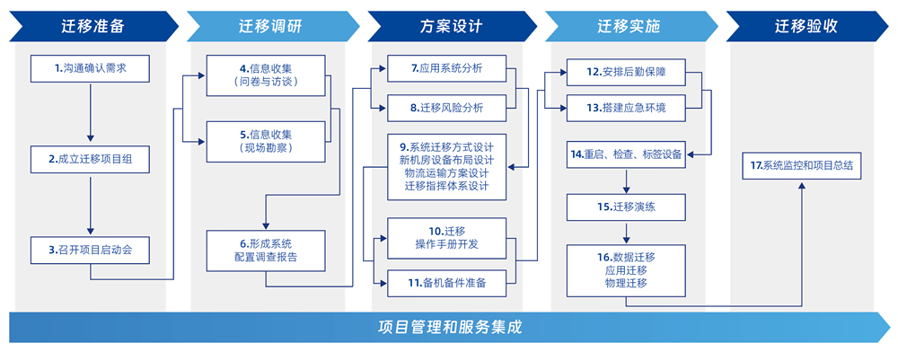 帮助客户进行数据中心的各类迁移服务,包括传统数据中心及新一代云数据中心的 IT 基础设施设备迁移、系统迁移、数据迁移、应用迁移、同城灾备/双活、异地容灾等各类场景迁移。设备包含主机、存储、网络、服务器、云平台、数据库、中间件、应用、灾备系统等各类软硬件。迁移服务通过制定迁移策略和计划,组织高效、准确地执行迁移,并在既定等停机窗口内完成数据中心的搬、迁、建、管、谋等过程。 一站式集成迁移服务能力:新一代数据中心规划、建设、优化、容灾、迁移、物流、备件、运维