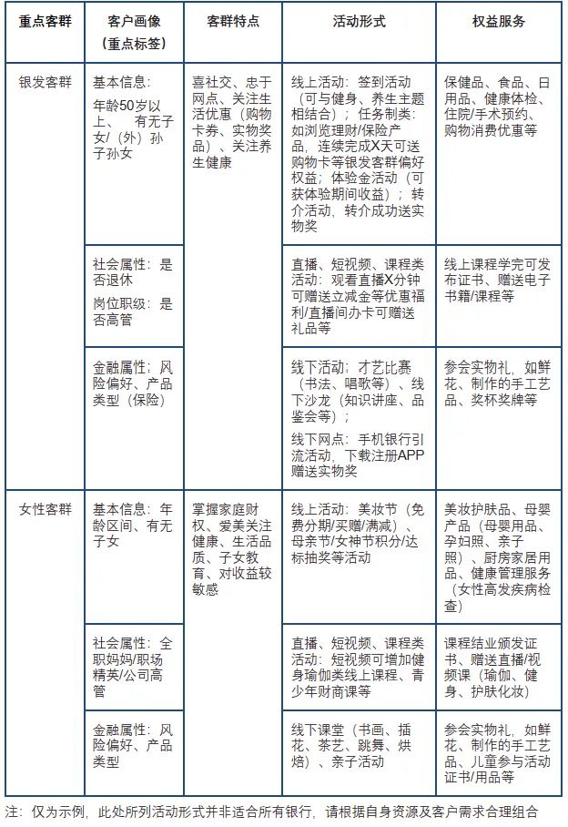 “适合的才是最好的”,作为示例(表2),根据当下多家手机银行需要重点经营的两大类客群的特点和配套策略做了详细的分析和拆解: